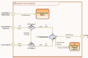 L'architecture matérielle de base d'un centre d'appels comprend trois points de liaison avec l'extérieur : un lien téléphonique, un lien vers un réseau privé ATM et un lien d'accès au réseau internet. Le point d'accès aux postes de travail permet de connecter les postes opérateur, support et dépannage.