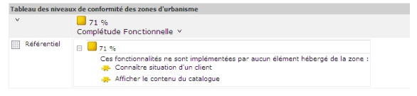 Le dernier tableau affiche les niveaux de conformité par zone d'urbanisme. Dans l'exemple ci-dessous, la zone "Référentiel" affiche une complétude fonctionnelle de 71%, qui s'explique par le fait que deux des fonctionnalités requises pour la zone ne sont pas implémentées par les applications de la zone.