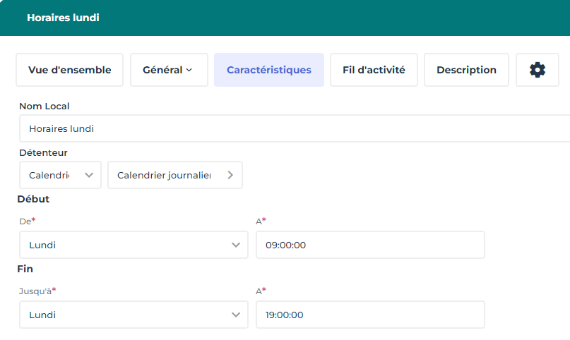 Vous pouvez créer un calendrier pour indiquer qu'un type d'employé travaille les lundis de 9h à 19h ainsi que les mardis et mercredis de 8h à 18h.