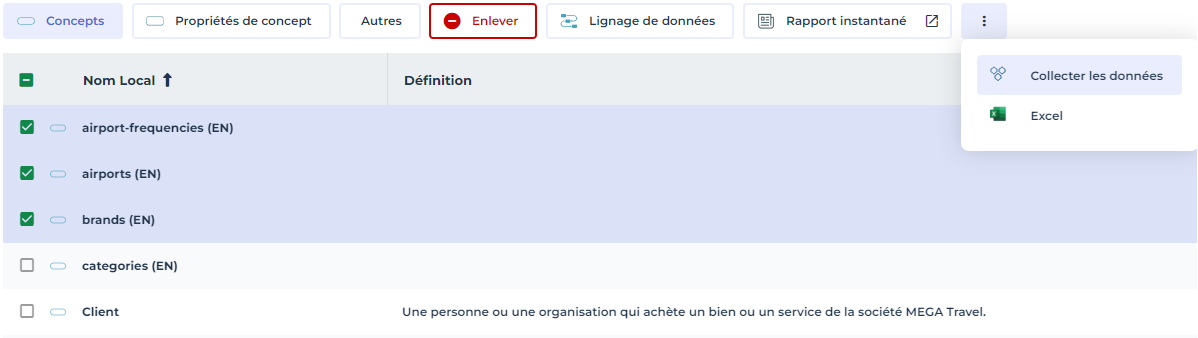 Sous la page Données métier des propriétés d'un catalogue de données apparaissent les données métier mises en œuvre par les métadonnées et/ou définies dans les domaines de concepts du catalogue de données.