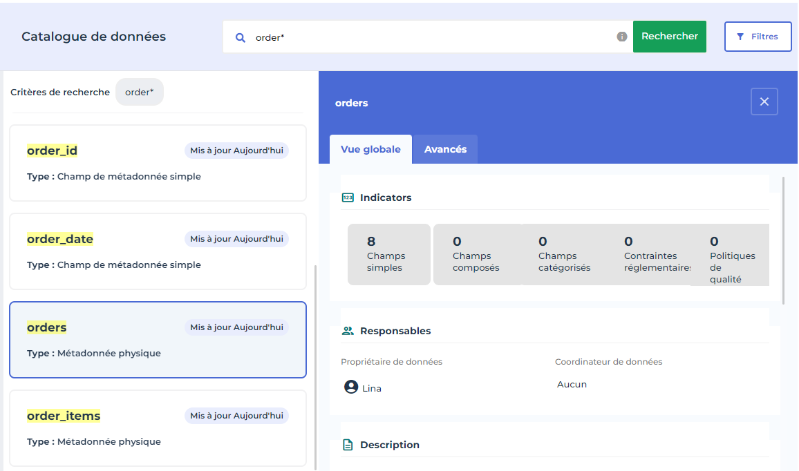 L'outil de recherche HOPEX permet de rechercher les métadonnées découvertes et importées dans un catalogue de données. Dans les résultats de la recherche vous pouvez :