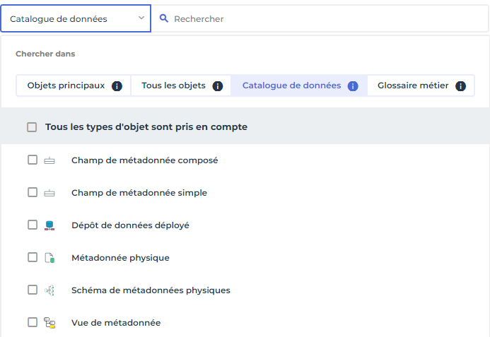 Les métadonnées concernées par la recherche sont les métadonnées physiques, les champs de métadonnées simples et structurés, les schémas, les vues de métadonnées et les dépôts de données déployés. Vous pouvez effectuer une recherche sur l'ensemble ou sur certains de ces objets.