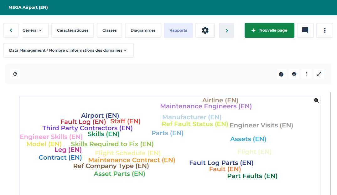 Ce rapport est disponible sur un conteneur d'informations, tel qu'un dictionnaire métier, un dictionnaire de données ou une base de données. Il présente sous forme de nuage de mots les informations en fonction de leur utilisation dans les domaines.