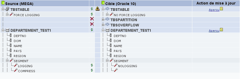 • Le symbole de mise à jour du SGBD par rapport à HOPEX. Les différentes actions possibles sur les objets sont :