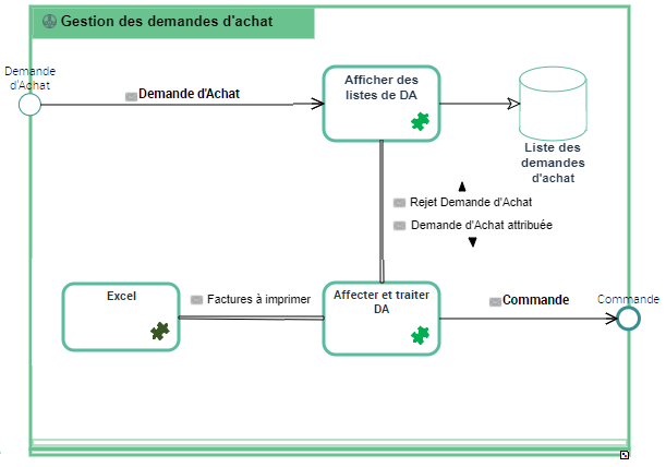 Le diagramme de scénario de flux ci-après décrit l'application “Gestion des demandes d'Achat”.