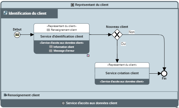 Le diagramme d'interface de service associé à l'interface de service “Identification du client” décrit, dans un formalisme BPMN, les opérations réalisées.