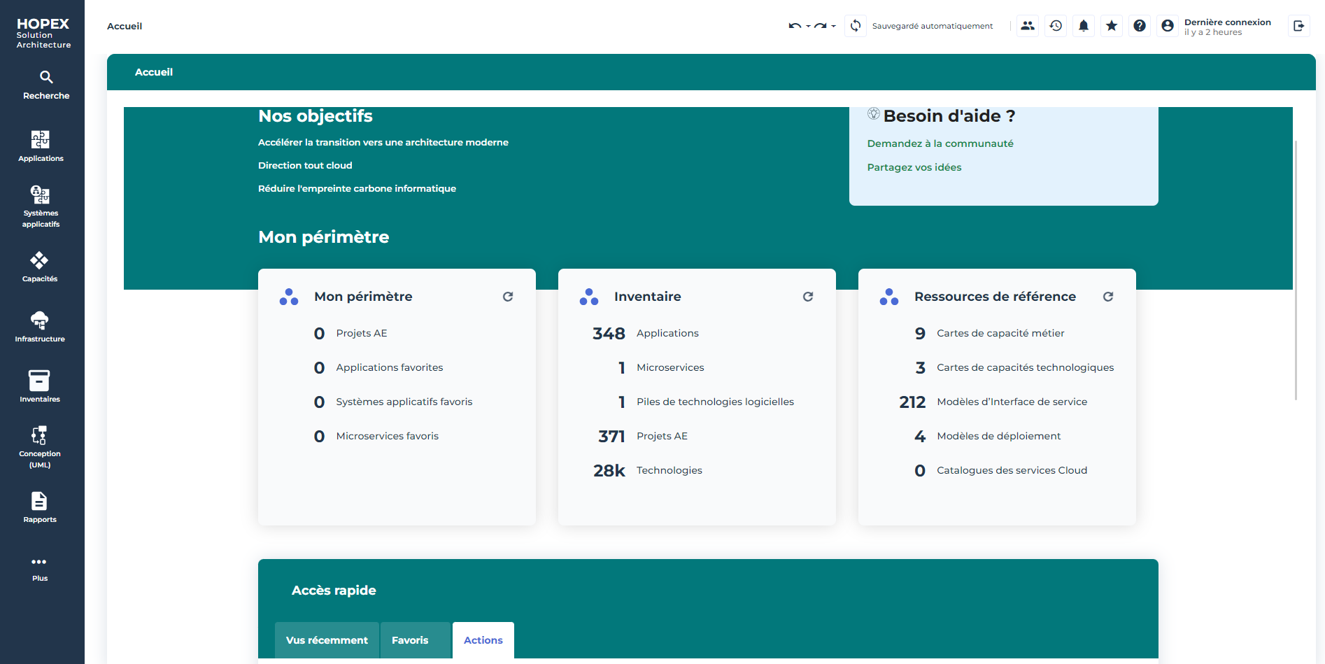 L'ensemble des utilisateurs connectés au produit HOPEX IT Architecture disposent d'un même bureau et de l'accès à différents menus de navigation.