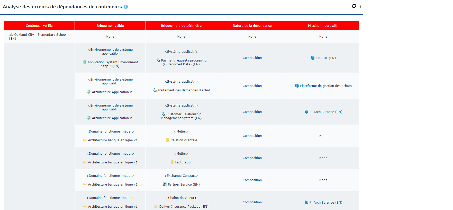 • Nature de la dépendance : indique la nature de la dépendance d'utilisation entre la brique non valide identifiée en deuxième colonne et la brique hors périmètre dans la troisième colonne (ex : directe, par composition).