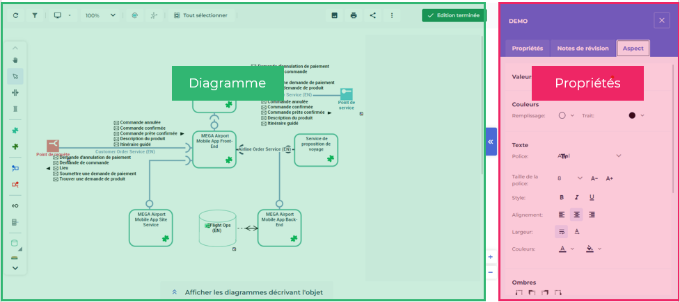 Si besoin, à droite du diagramme, vous pouvez afficher les fenêtres de Propriétés, d'ajout de Notes de révision et d'Aspect.