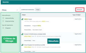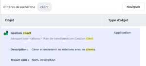 Par exemple la recherche de la chaîne "client" a été trouvée dans l'objet "Gestion client" de type Application, dans son Nom et sa Description.