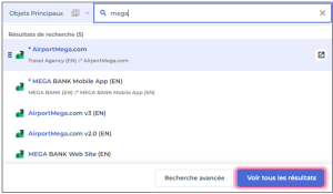 En cas de besoin, accédez à une vue détaillée des résultats après avoir lancé une recherche plein texte. Ces résultats sont basés sur le nom ainsi que sur tous les attributs des objets concernés par la recherche.
