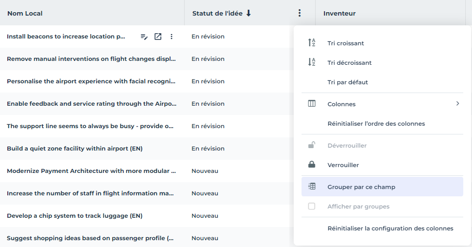 Pour afficher les idées selon leur statut (nouveau, à l'étude, etc.) :