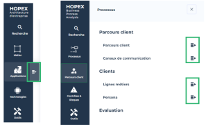 Dans certaines Solutions, les cartes affichent des boutons au passage de la souris. Ces boutons donnent accès à des éléments relatifs à l'objet de la carte. Les éléments sont présentés sous forme d'arborescence ou de liste.
