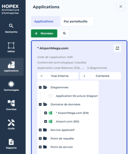 Exemple d'arborescence dépliée dans la carte d'une application (bureau HOPEX Architecture d'Entreprise).