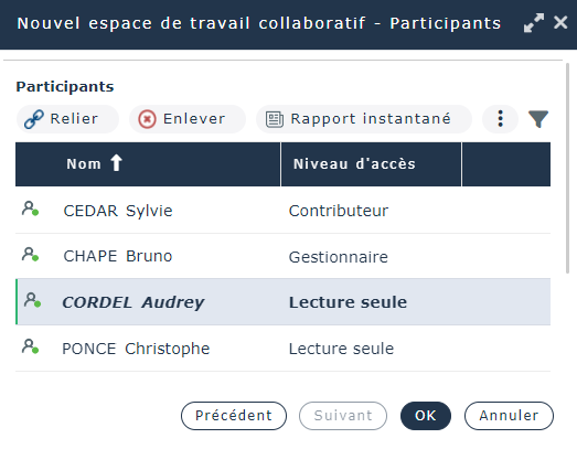 La fenêtre des participants à l'espace de travail collaboratif apparaît.