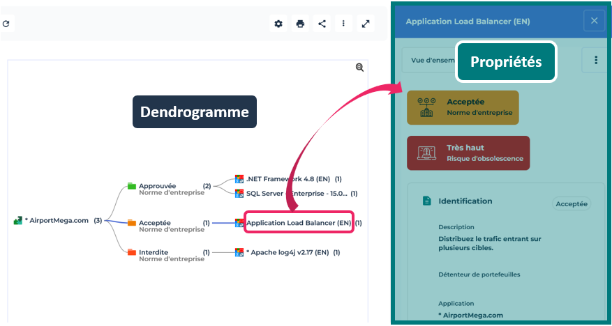 Ex. : dans un dendrogramme, cliquez sur l'objet. Le chemin depuis l'objet source est mis en avant par un trait épais bleu.