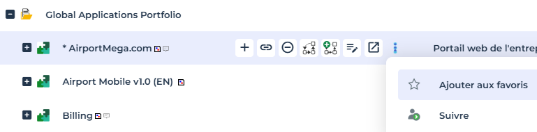 Dans une arborescence, lorsque vous passez la souris sur la ligne d'un objet, une liste de boutons apparaît :