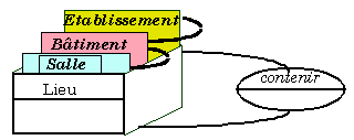 Une salle de classe est contenue dans un bâtiment, lui-même contenu dans un établissement scolaire.