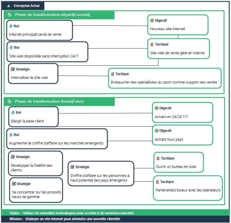 Le diagramme d'entreprise permet de décrire les liens entre les buts d'entreprise, stratégies, tactiques et phases de transition.