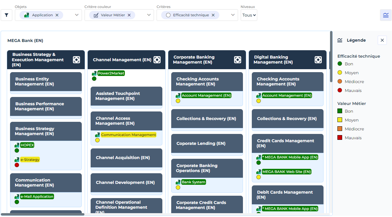 L'exemple ci-dessous présente la couverture de la carte de capacités métier par les applications, avec les critères "Efficacité technique" et "Valeur métier" disponibles sur les applications.