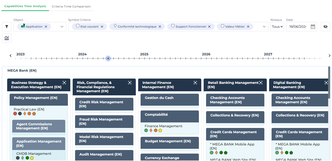 • Analyse des capacités dans le temps : une carte proportionnelle affiche les différentes capacités métier et les applications qui les couvrent.
