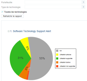 Un MetaAttribut Alerte de support disponible sur chaque technologie compare le cycle de vie officiel d'une technologie (importé de BDNA ou d'IT-Pedia ou spécifié manuellement) avec son cycle de vie dans l'organisation.