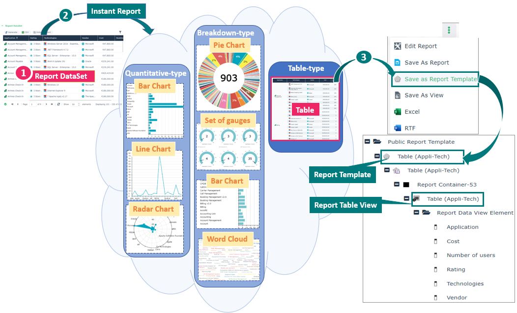 A public Report Template displaying the chart (table, radar chart, line chart, bar chart, pie chart, or word cloud) is created, with its public Report Table View. They both have the same name.