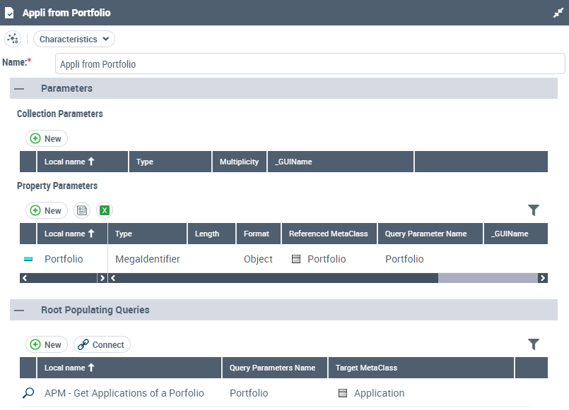 • The Parameters section displays the Property Parameter automatically created when used in the populating query.