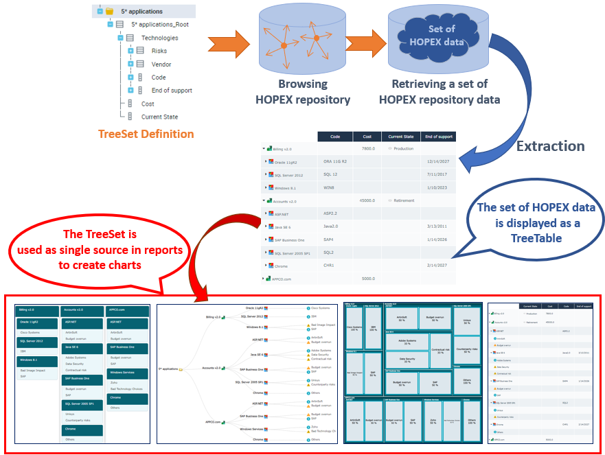• Phase 2: Display of this set of HOPEX data as a tree (Breakdown, Dendrogram, TreeMap, and TreeTable).