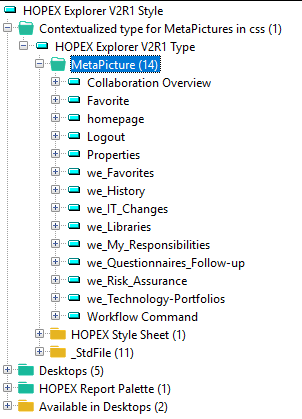 “HOPEX Explorer V2R1 Type” is connected to “HOPEX Explorer V2R1 Style” style sheet. It includes 14 pictures, which overload the corresponding 14 standard pictures in the context of “HOPEX Explorer V2R1 Style”.