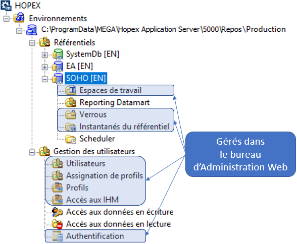 • Référentiels qui contient le référentiel SystemDb ainsi que les référentiels HOPEX référencés dans l'environnement pour gérer :