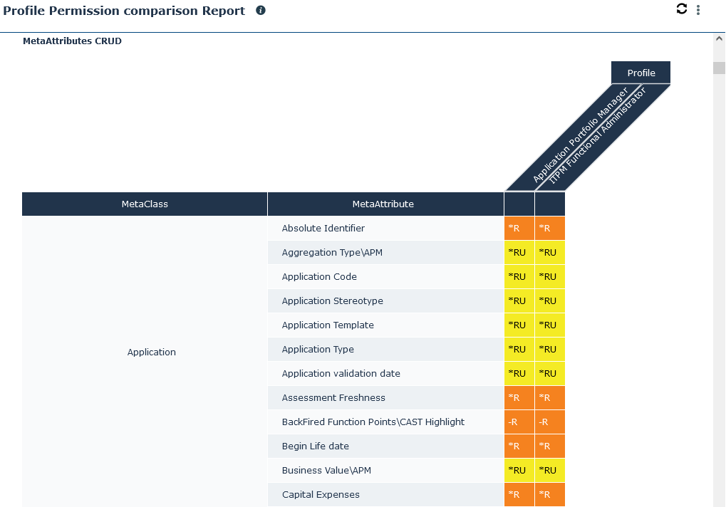 Ex. : rapport de comparaison des permissions des profils Gestionnaire de portefeuille applicatif vs Administrateur Fonctionnel de l'ITPM, ici les permissions d'une partie des MetaAttributes de la MetaClass Application.