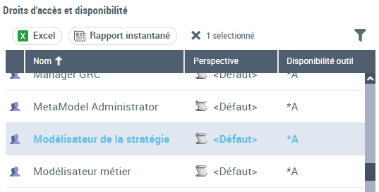 4. Dans le cadre Droits d'accès et disponibilité, sélectionnez l'Ensemble de droits d'accès aux IHM pour lequel vous voulez modifier l'accès sur l'outil.