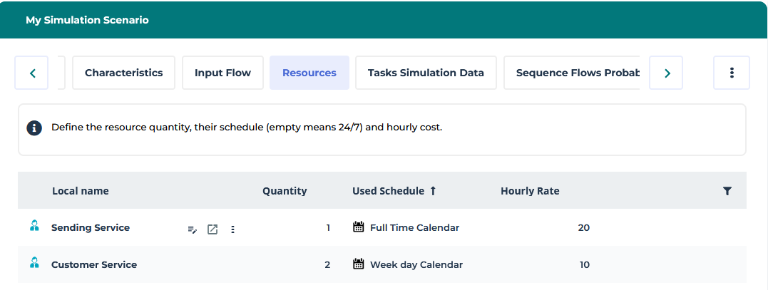*For more details on setting up the resources of the simulated process, see Input flow.