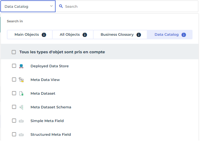 The metadata concerned by the search are meta datasets, simple and structured meta fields, schemas, metadata views and deployed data stores. You can search for all or some of these objects.