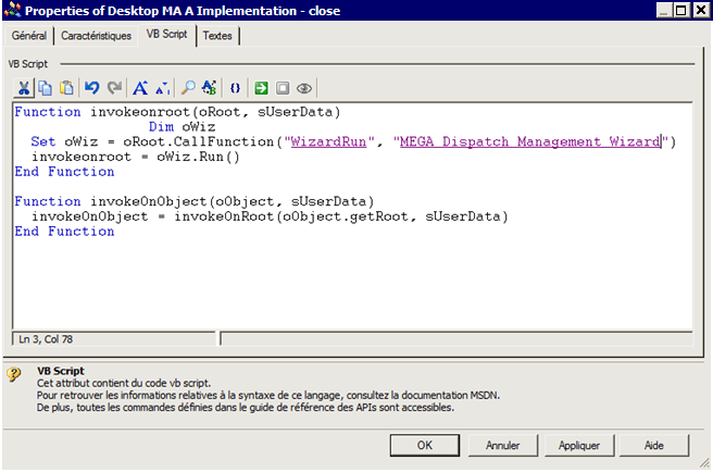 8. Access the properties of the MEGA Parameterized Tool concerned by the context.