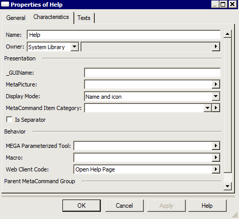 For each command (of MetaCommand Item or MetaCommand Manager type) you must define its name (_GUIName) and display icon (MetaPicture) in the user interface, as well as the Command Category to which it belongs. This category is one of the standard categories supplied by MEGA.