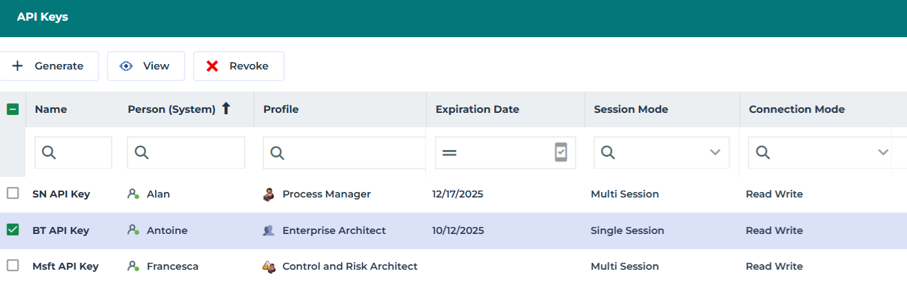 API keys are used to securely establish sessions with HOPEX, for example when working with GraphQL, ServiceNow Integration or Teams Integration.