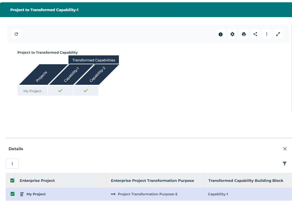 For example, the Project to Transformed capability report presents a matrix of capabilities impacted by specifiic Projects.