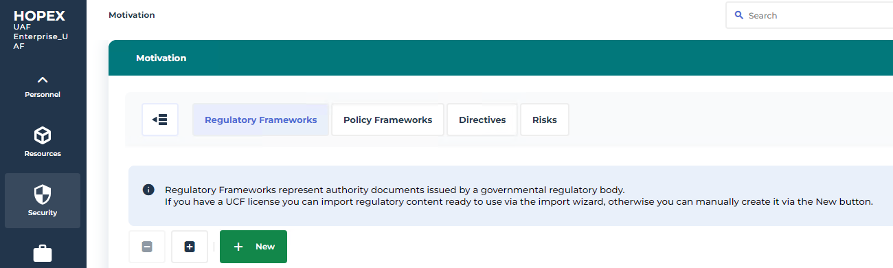 In HOPEX UAF, any risk should be associated to a Security Control. A Security Control is implemented as Regulation Article and Security Control Family is implemented as Regulation Section.
