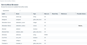 A table appears and shows all the fields and their characteristics (type, maximum length, possible values, etc.) for a given object type in ServiceNow.