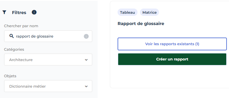 4. Passez la souris sur le modèle "Rapport de glossaire" et cliquez sur Créer un rapport.