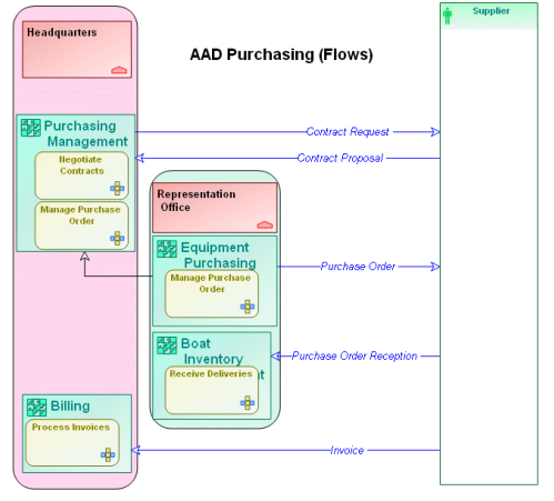 The "Negotiate Contracts", "Receive Deliveries", and "Process Invoices" activities are handled by the "Purchasing Management", "Boat Inventory Management", and "Billing" applications respectively.
