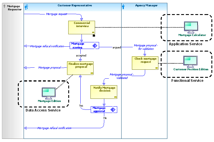 In the following example, the "Handle a real estate credit order" process is partially accomplished by the branch manager who implements the operation: “Study and give ruling on the credit request”. The realization of this operation is assisted by a functional service: “Summary of Client Situation”.
