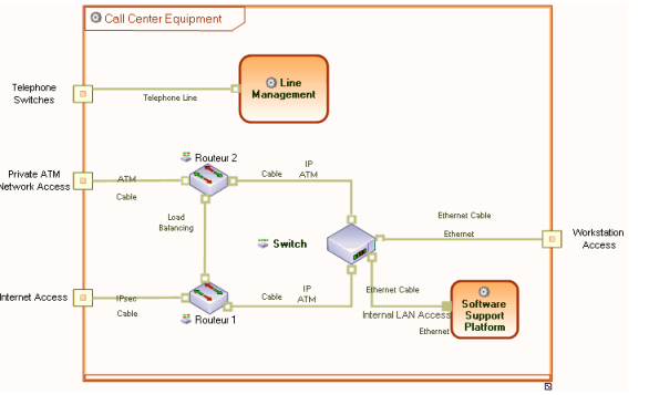 Basic equipment architecture of a call center includes three link points with the exterior: a telephone link, a link to a private ATM network and an internet access link. The workstations access point enables connection of operator, support and troubleshooting stations.