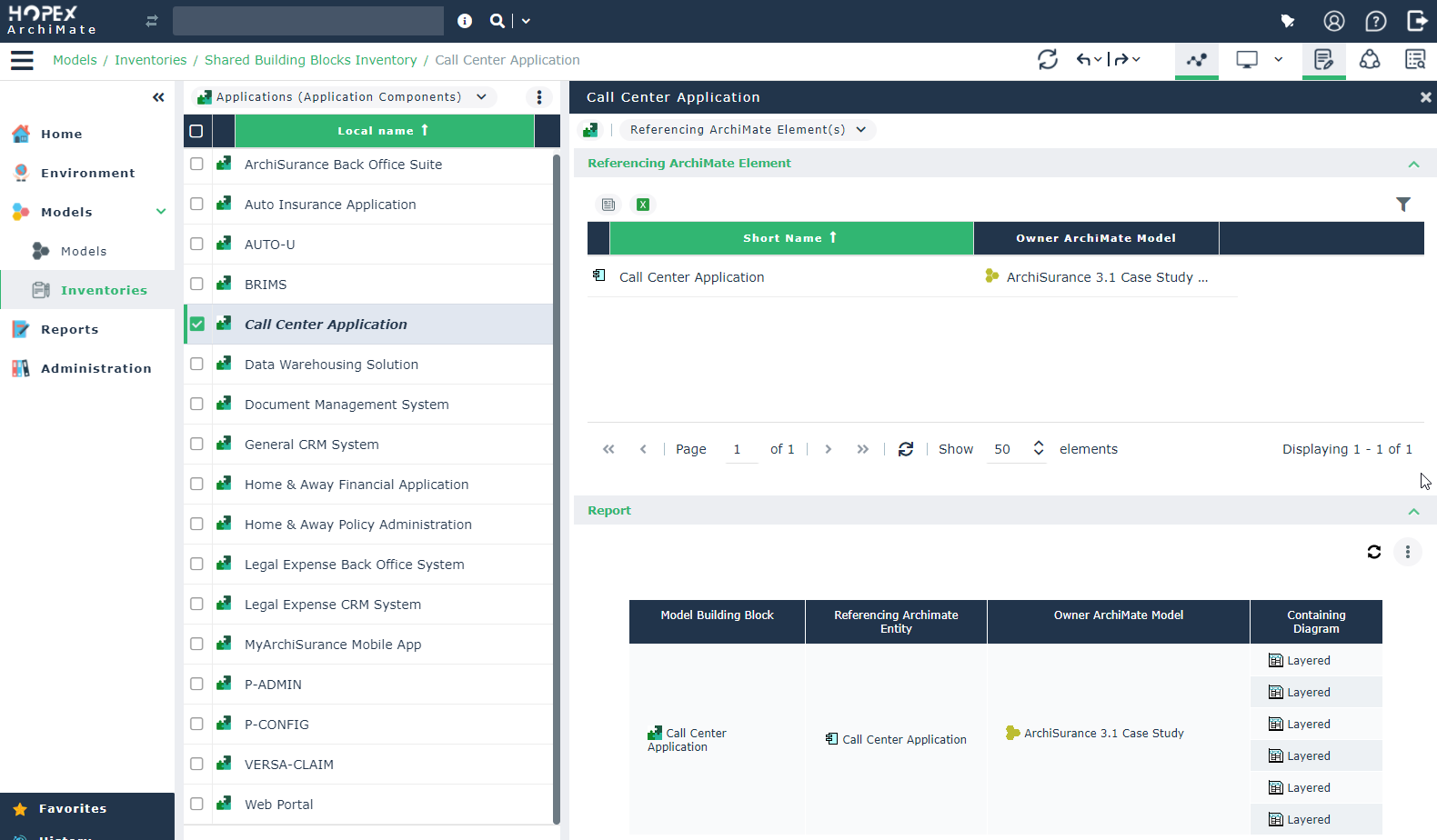 The Referencing ArchiMate Element(s) report, enabling a view of the use of a component across the various ArchiMate® models.