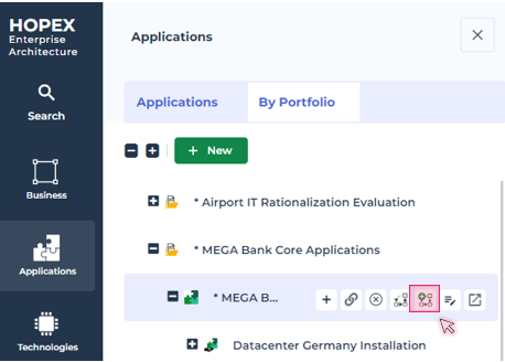 As far as trees are concerned, they can contain icons representing a shortcut to the creation of a diagram. These icons appear when hovering the cursor of the object name.