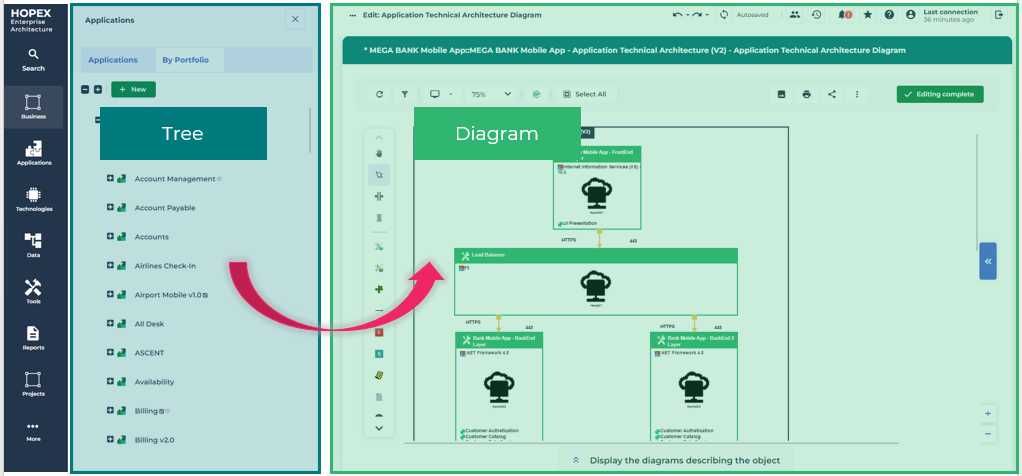 1. From an object in the Browsing area, open its diagram in the edit zone.