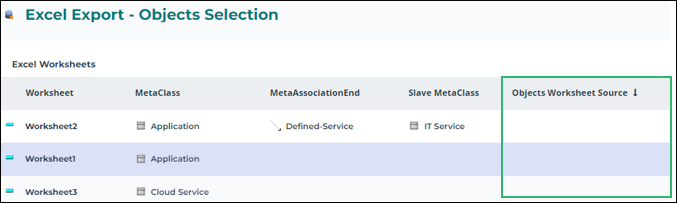 2. Click in the Object Source Worksheets column and select the name of the worksheet that contains objects to be exported.