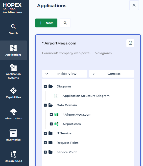 Example of an unfolded tree in a list of application cards on the HOPEX IT Architecture desktop.